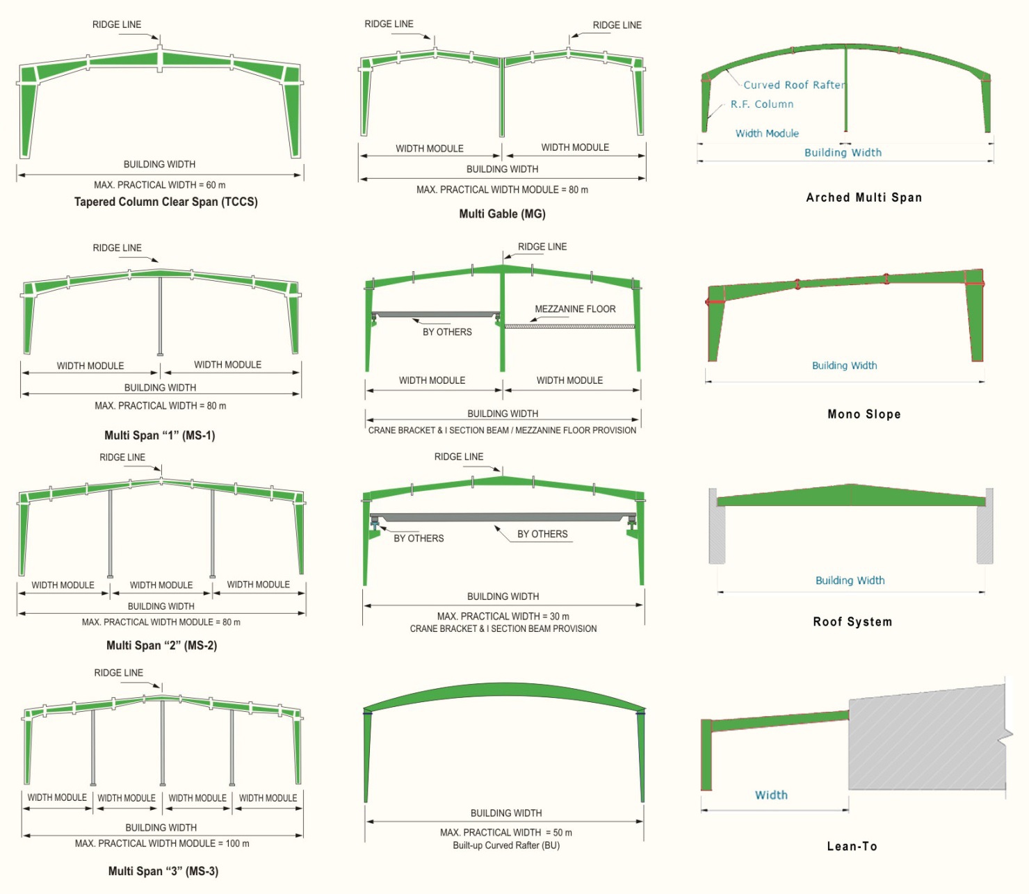 The most common primary systems are shown below. All shown are symmetrical about the ridge line. Framing systems about the ridge line and multi-span framing systems with unequal width modules are also possible, as symmetrical. In fact, practically any frame geometry is possible.